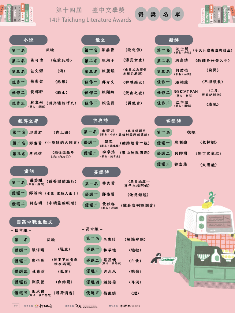 第十四屆臺中文學獎得獎名單_新 今年(114年)辦理臺中文學獎,總獎金高達168萬元,本屆創作獎徵件文類分為小說、散文、新詩、古典詩、臺語詩、客語詩、童話、國高中職生散文、報導文學等9大類,經初、決審,共選出43件得獎作品,恭喜得獎者!謝謝今年所有參與的投稿者!