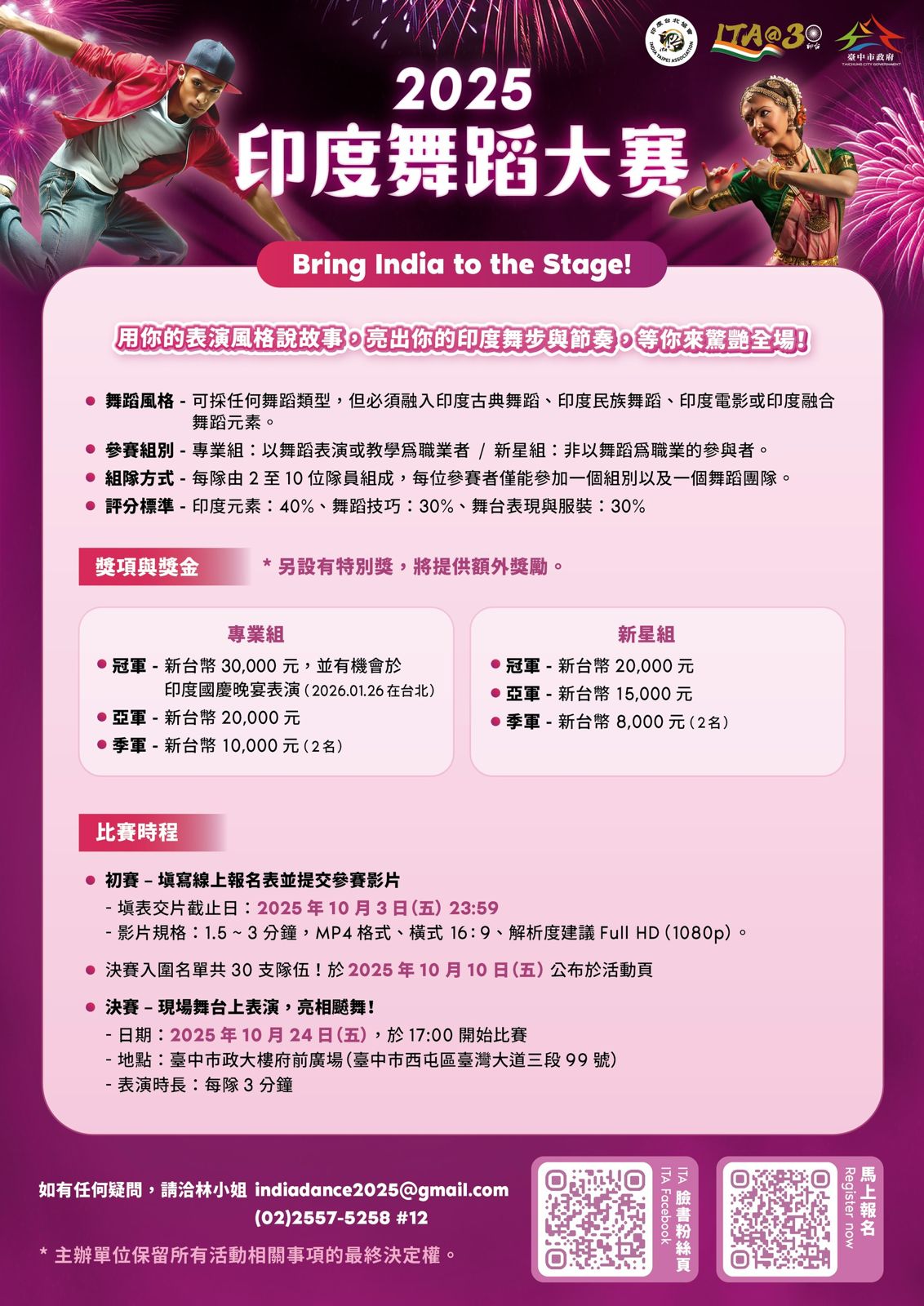 二、旨揭印度舞蹈大賽初賽以影片參賽,鼓勵跨界融合,將街舞、現代舞、甚至芭蕾等不同舞種與印度文化巧妙結合的獨特風格,只要作品中含有印度元素,皆歡迎踴躍報名,線上報名參賽截止日期為114年10月3日,初審評審將從影片中選出最具潛力與創意的30組隊伍,脫穎而出的舞者將於10月24日(星期五)下午5時,在臺中市政府市政大樓府前廣場進行決賽,參賽辦法與最新宣傳資訊詳見「India Taipei Association-印度台北協會」臉書連結 https://www.facebook.com/ITATW。