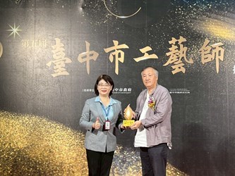 文化局補充,截至這屆已有14位工藝師獲得此一殊榮。廖勝文工藝師在研習漆藝隔年即入選全國美展,此後更陸續獲得大墩美展、傳統工藝獎等肯定,是台灣當代漆藝的重要創作者之一。他目前於大甲鐵砧山下成立「鐵山漆坊」專注創作與推廣,並於民國105年被登錄為台中市傳統漆藝—夾紵漆器保存者。廖勝文分享,其原從事醬菜工作,因勞動造成肌肉拉傷,人生因緣際會踏入漆藝領域,從陳火慶國寶級技藝班結業後即全心投入漆藝創作,希望讓漆工藝重新走進人們生活。