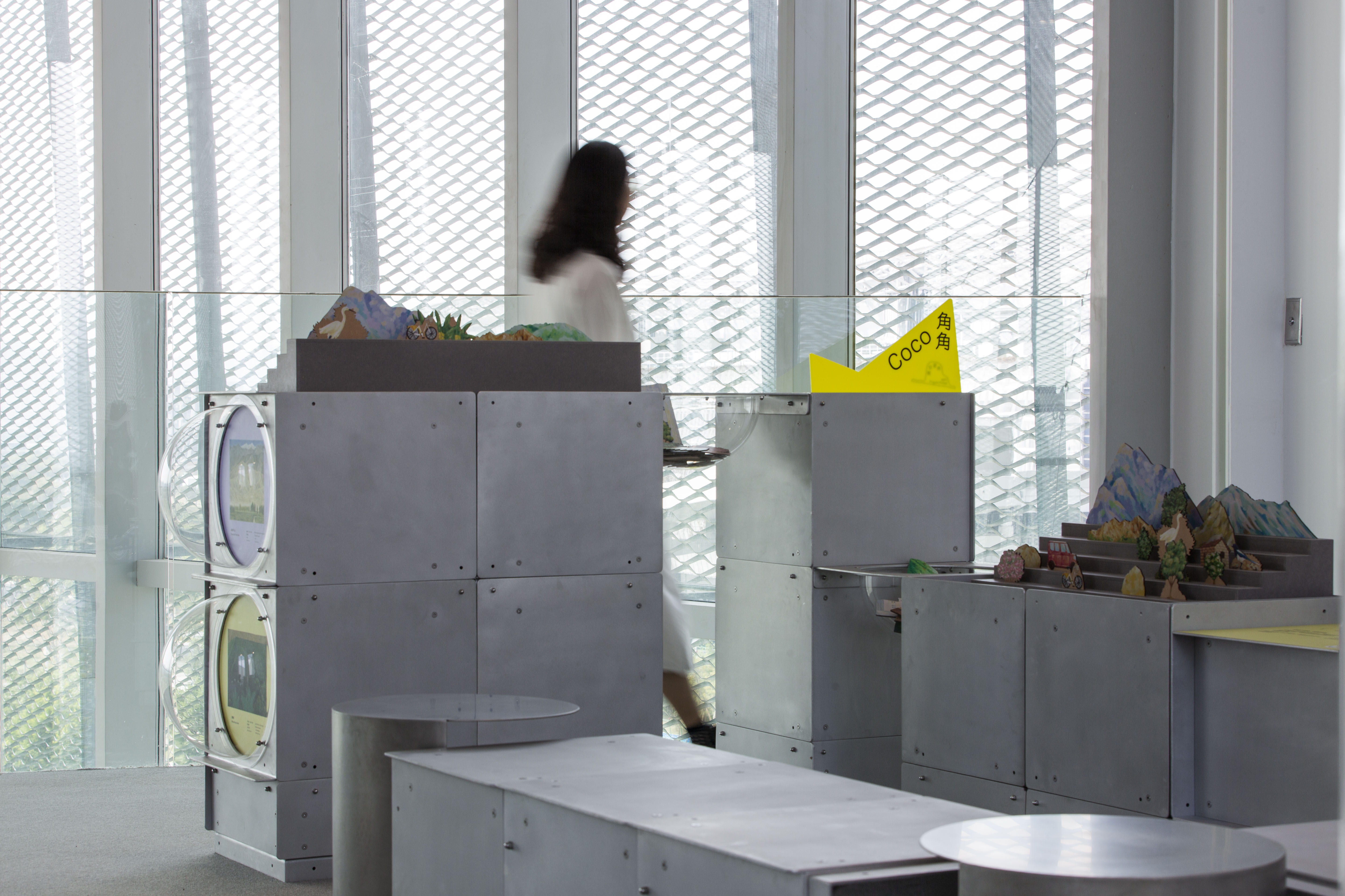 教具特別採用金屬材質的模組化家具,除呼應綠美圖建築的外觀特色外,也依據每一檔的教具內容、不同使用者的身體尺度、以及空間大小自由組裝,結合美術館既有家具且可重複使用,打造出具低碳精神的永續方案。