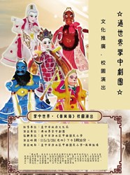 「通世界」為王啟文和其弟王鎮守於彰化田中共同創立,王啟文曾隨黃俊卿學藝,劇團於1983年立案。第二代王承澤十多歲時隨父親四處演戲,亦曾參與文化推廣活動,如2011年在臺北大稻埕戲苑演出、雲林布袋戲館、彰化縣傳統戲曲演出。本活動於校園推廣演出,以「西遊記」故事編演《黃風嶺》,向下扎根,推廣偶藝。
