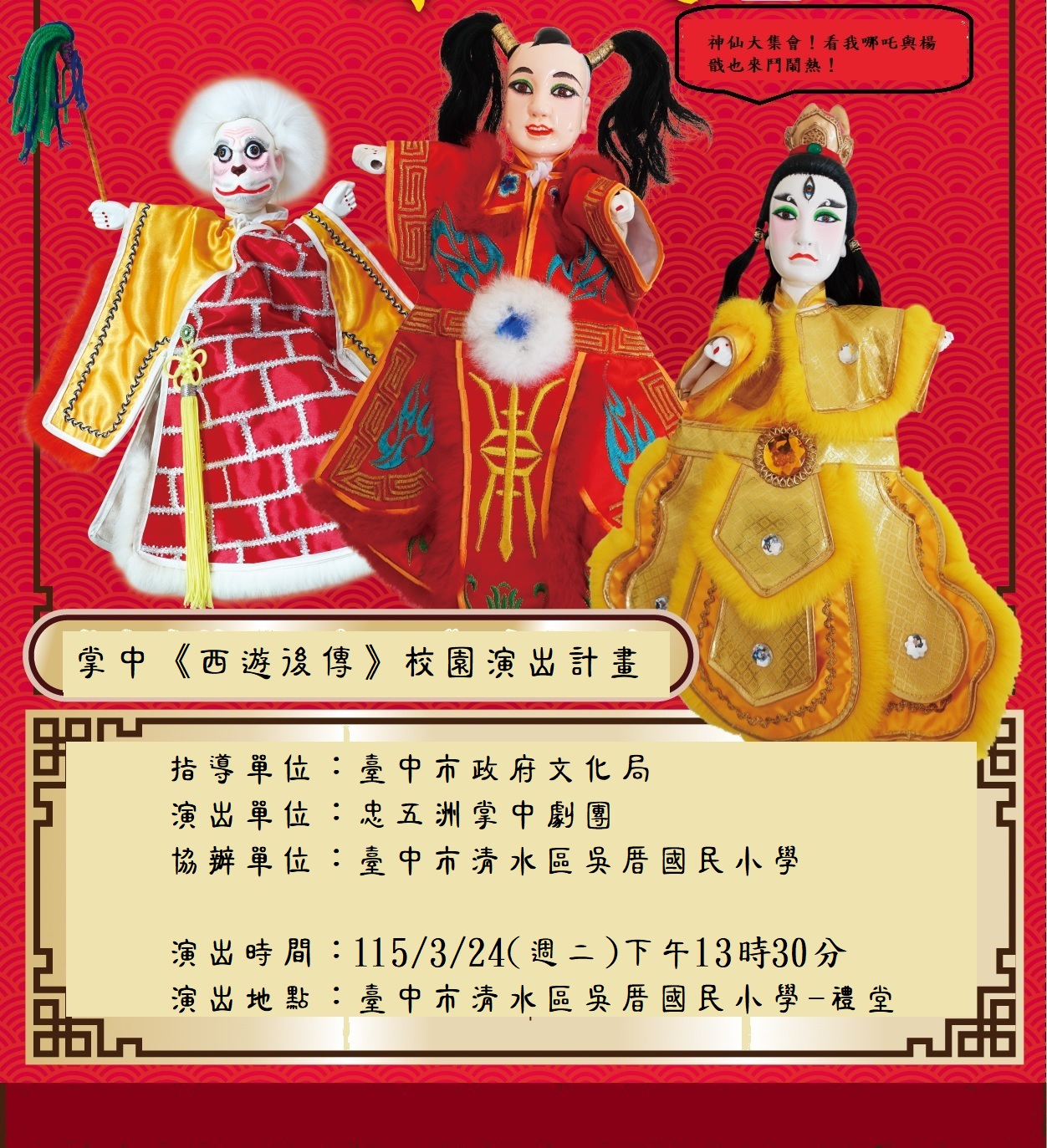 團長張二郎先生,自小師承父親張松茂先生,接掌團務,立基於清水,推廣布袋戲。大多於廟會演出,2006年開始推展校園布袋戲。本次校園演出《西遊後傳》,以環保主題引發趣味,敘述:萬壽山鎮元子召開神仙大會,招待貴賓。邀請唐僧師徒共聚一堂,但黑暗組織趁機搗亂,山莊一時手忙腳亂。幸好眾人想出對策,協力打敗毒王,維護環境。