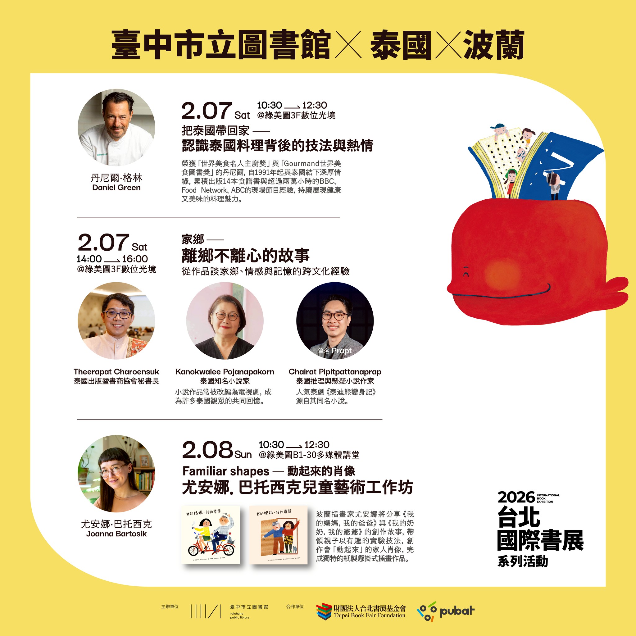 親子族群同樣能在國際交流中找到樂趣。28日上午,將由波蘭童書作家暨插畫家尤安娜.巴托西克(Joanna Bartosik)帶來兒童藝術工作坊,分享繪本《我的媽媽,我的爸爸》與《我的奶奶,我的爺爺》的創作故事,並引導親子動手製作「會動起來」的家人肖像,讓孩子在創作中體驗閱讀與藝術的樂趣。
