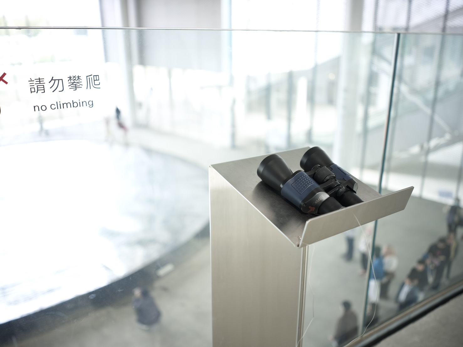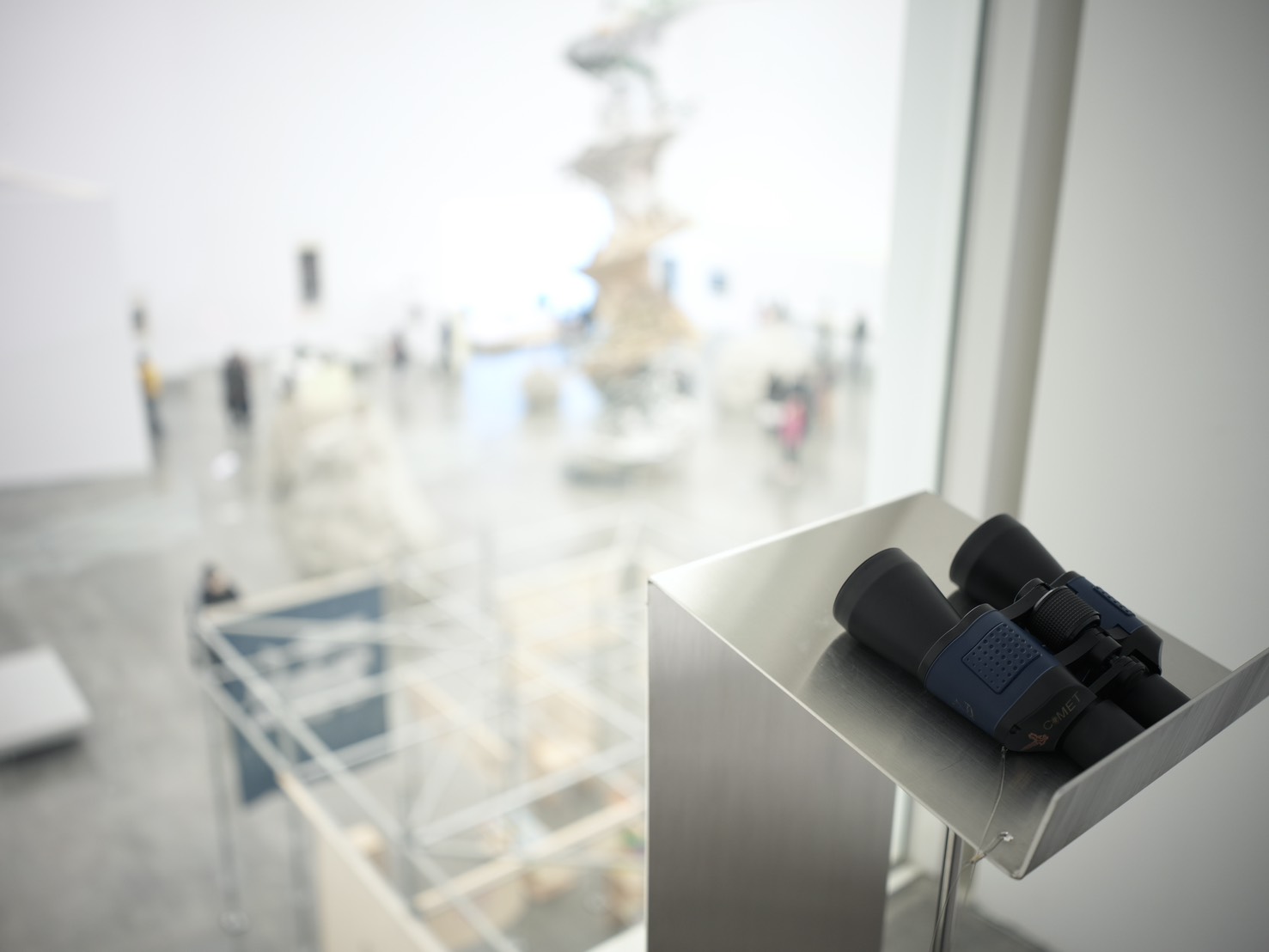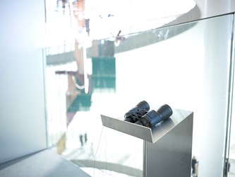 美術館六樓設有兩處不同觀看方向的望遠鏡,一處在五樓往六樓的外掛梯,視野遼闊,可盡覽中央公園熱門的野餐點、會展中心及周邊城市景觀,呈現最chill的視角;另一處則隱身展間後的公共空間中,透過望遠鏡向下觀看五樓展場,捕捉作品與觀眾互動的瞬間,為參觀體驗增添意外驚喜。