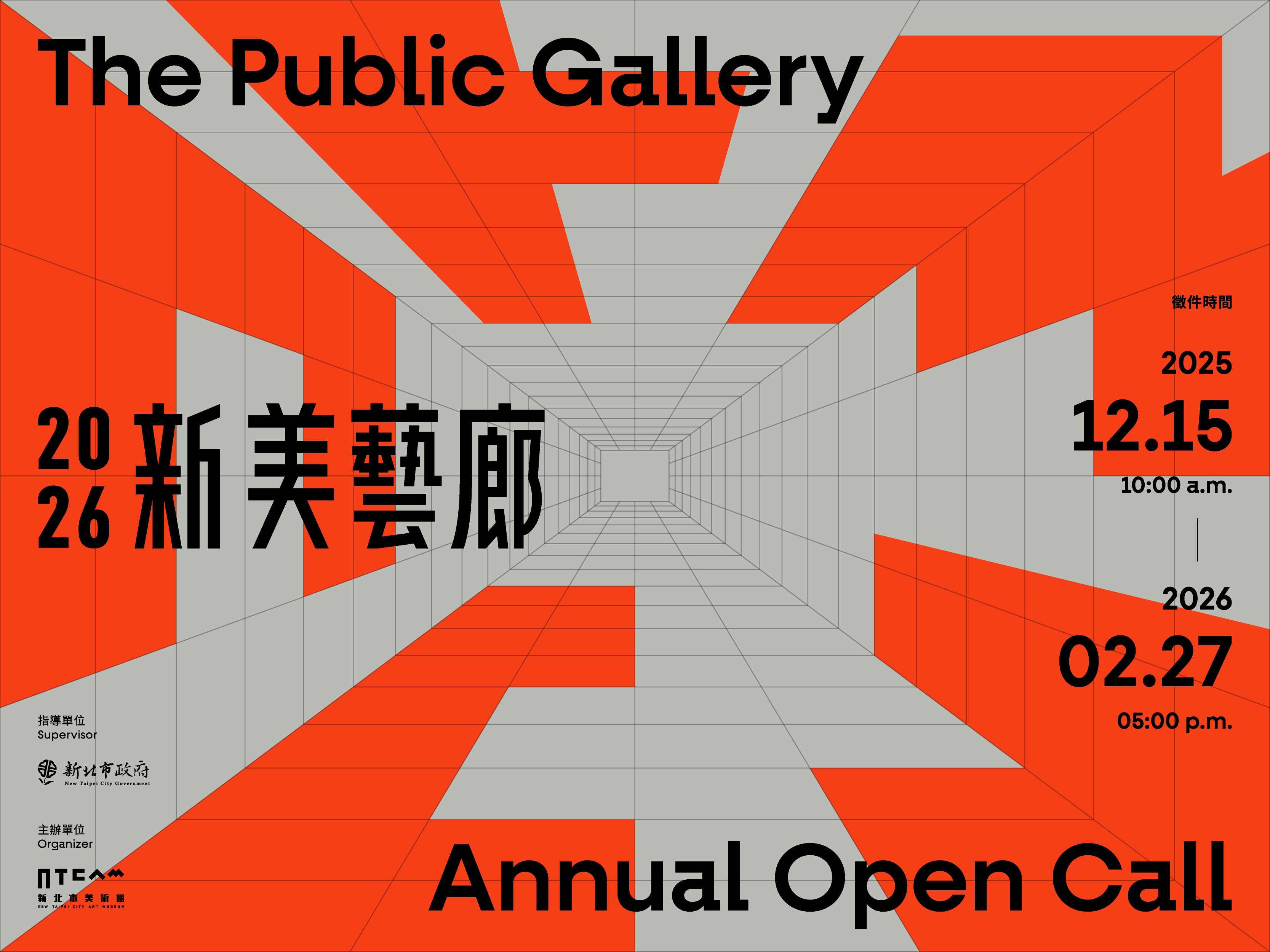 一、 「2026 新美藝廊」徵件秉持立基在地、不限媒材與形式的原則,凡設籍新北市,或於新北市工作、就學或居住1年以上之藝術創作者均可參加,徵件日期即日起至115年2月27日止全面開放線上申請。