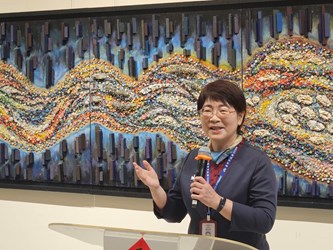 臺中市大墩文化中心於新歲之際推出鑲嵌藝術大師簡源忠教授《若水 靜謐而流動》,是場極具「重量級」的藝術盛宴。市府文化局長陳佳君今(21)日出席開幕式,見證首度公開的巨幅馬賽克作品〈母親之河—麻園頭溪〉,肯定簡教授對藝的術傳承與貢獻,另「若水」系列靈感則源自2021年市長盧秀燕祈雨,觸動藝術家以流經臺中的溪流為題。歡迎市民朋友在春節尾聲走進展場,感受這結合200萬片碎石、彩色玻璃與琉璃、歷時三年半才完成的城市光影律動創作。