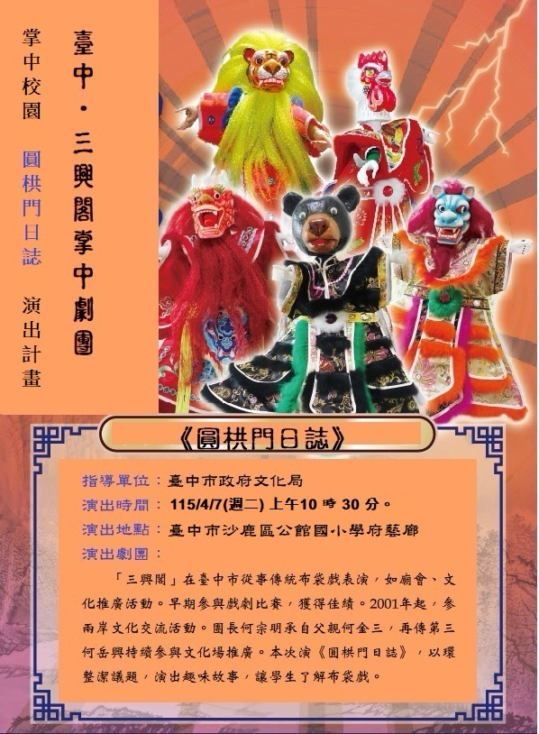 「三興閣」在臺中市從事傳統布袋戲表演,如廟會、文化推廣活動。早期參與戲劇比賽,獲得佳績。2001年起,參與兩岸文化交流活動。團長何宗明承自父親何金三,再傳第三代何岳興持續參與文化場推廣。本次演出《圓栱門日誌》,以環境整潔議題,演出趣味故事,讓學生了解布袋戲。