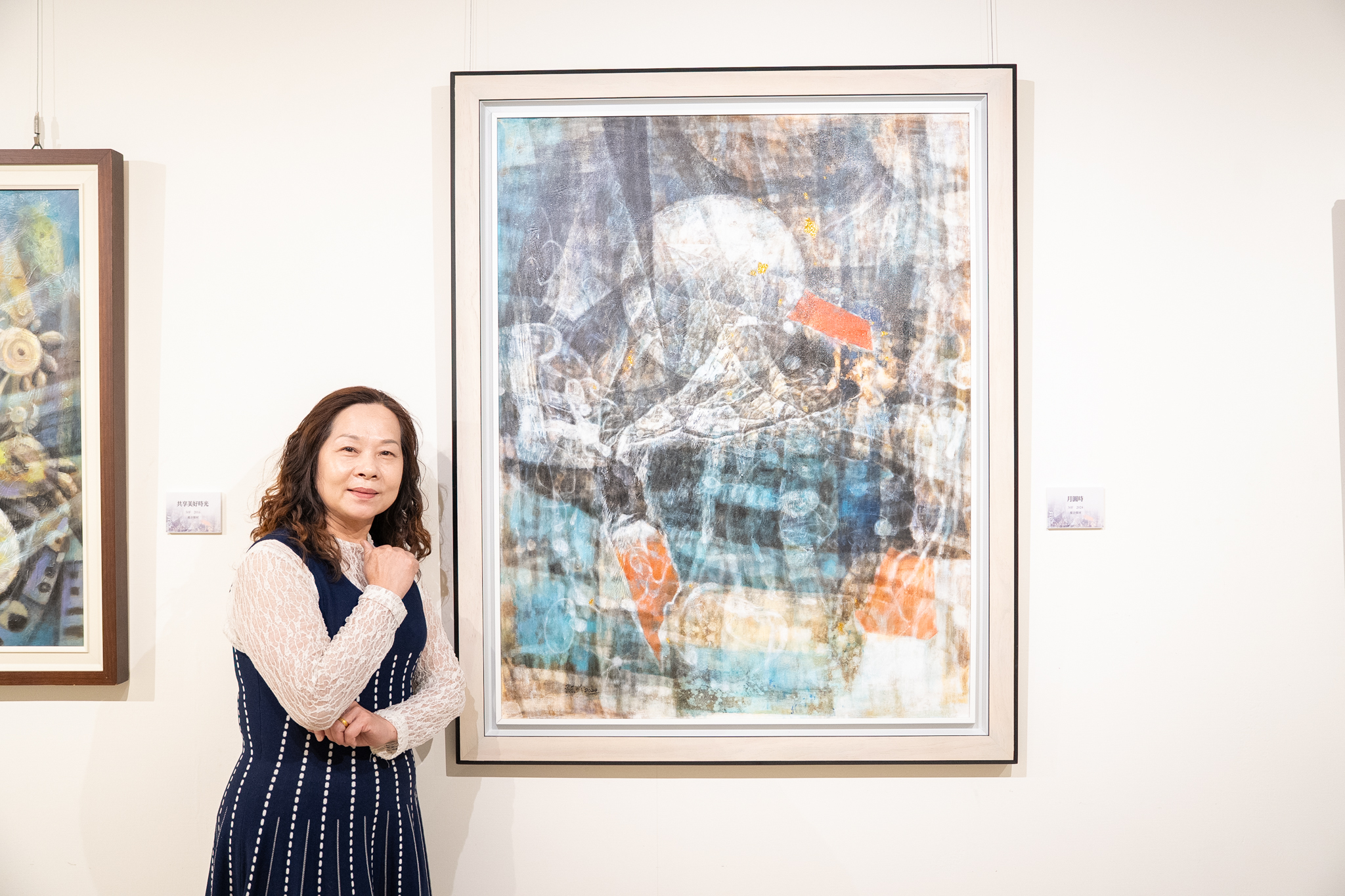 作品《香遠益清》則來自藝術家對故鄉花蓮的記憶。她將街旁盛開的山芙蓉轉化為畫布上的光影節奏,透過層層疊合的色彩與花朵意象,如同一次生命的悄然覺醒。而作品《月圓時》則以藍灰與橙紅色調交織出溫暖而深邃的夜色,象徵圓月的光影灑落金銀光輝,勾勒童年團聚的美好記憶,也象徵生命的圓滿與希望。「形‧心之境」展期至426日,觀者透過畫布色彩與光影,感受時間流動的藝術溫度與生命故事,找到屬於自己的情感回聲。